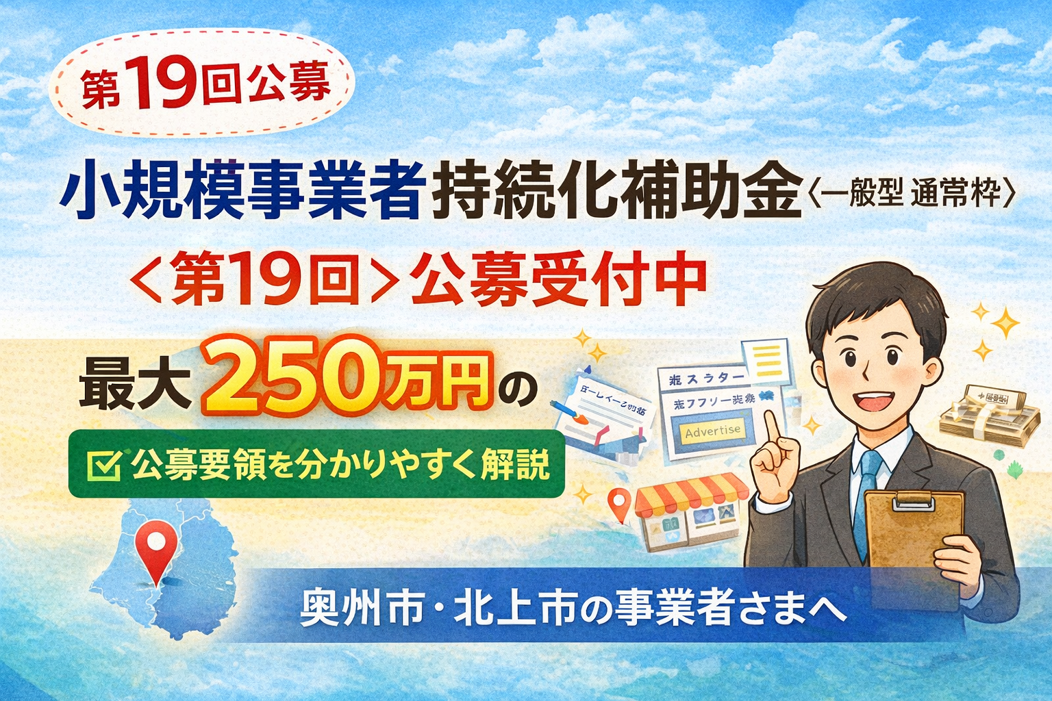 小規模事業者持続化補助金〈一般型 通常枠〉第19回公募の内容を、できるだけ分かりやすく整理しました。