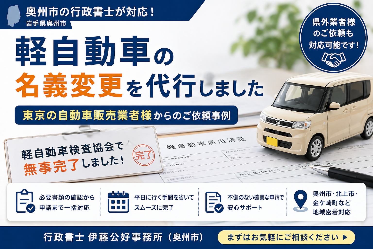 「岩手県のお客様に販売した軽自動車の名義変更をお願いしたい」
